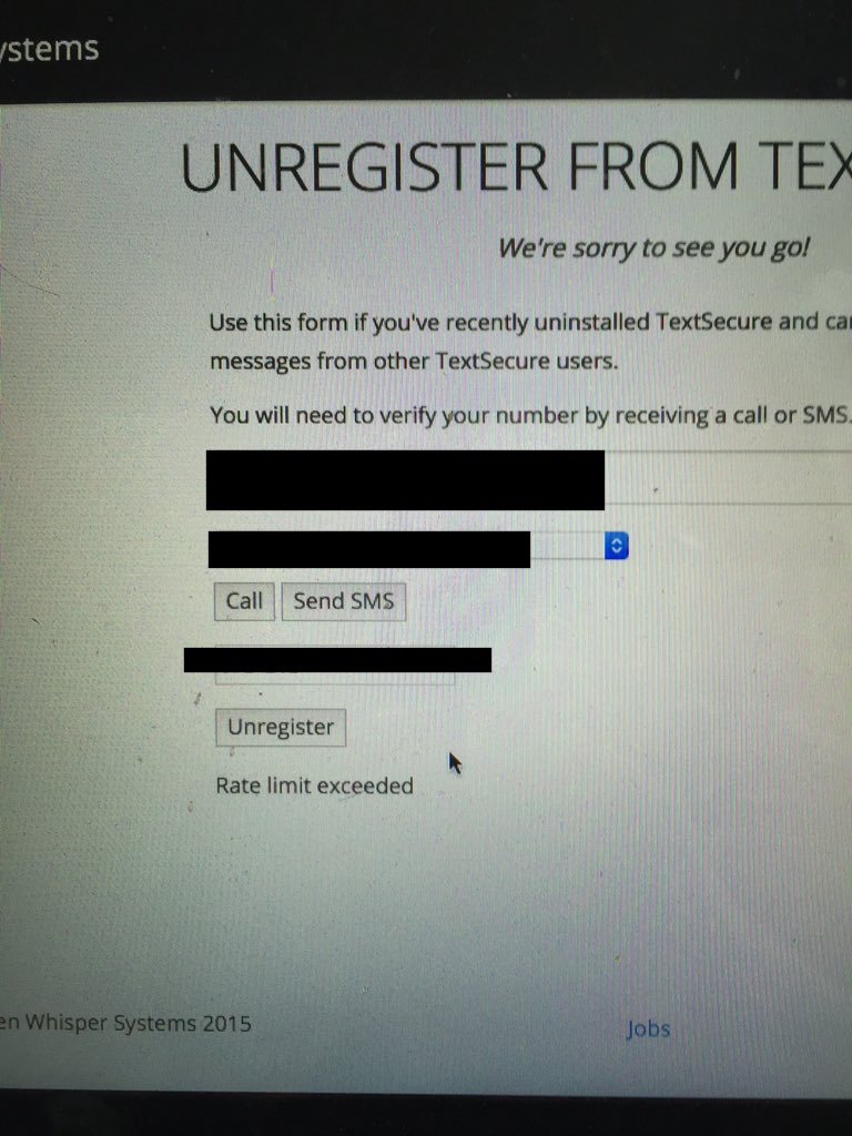 Hey @whispersystems what does "rate limit exceeded" means when you try to unregister (asking for a friend)pic.twitter.com/N0f85l1npD