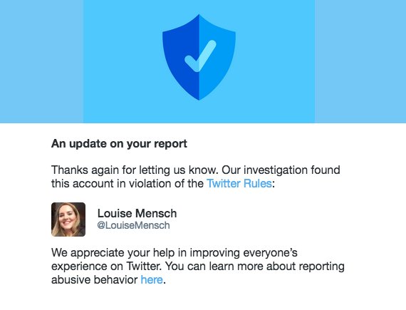 I reported Louise Mensch for what must have been a year ago and Twitter finally agreed it violated their rules. Still satisfied!pic.twitter.com/sq98vvs90S