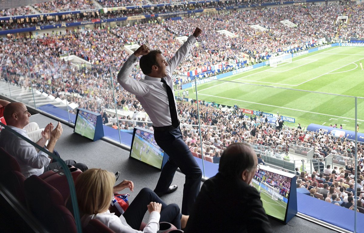 French President Macron jumps on a table to cheer France on to its 4-2 victory in