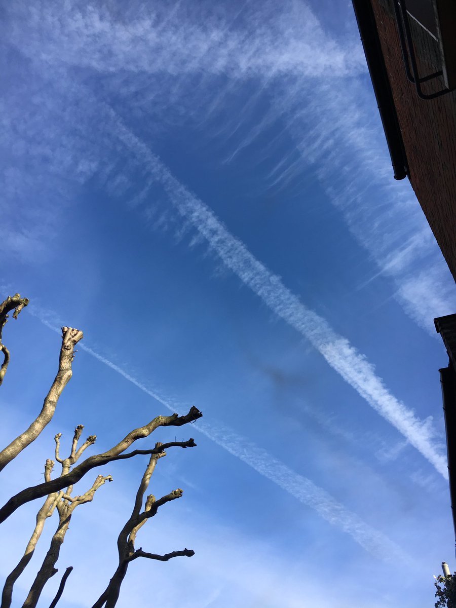 Exhibit A + B: image one has two valid aircraft. Foreground plane is at low altitude so no contrail is formed. Background plane is high enough to produce valid contrail. It's like the wake of a ship, it dissipates. Image Two has an invalid trail, extending across the sky. (Below)