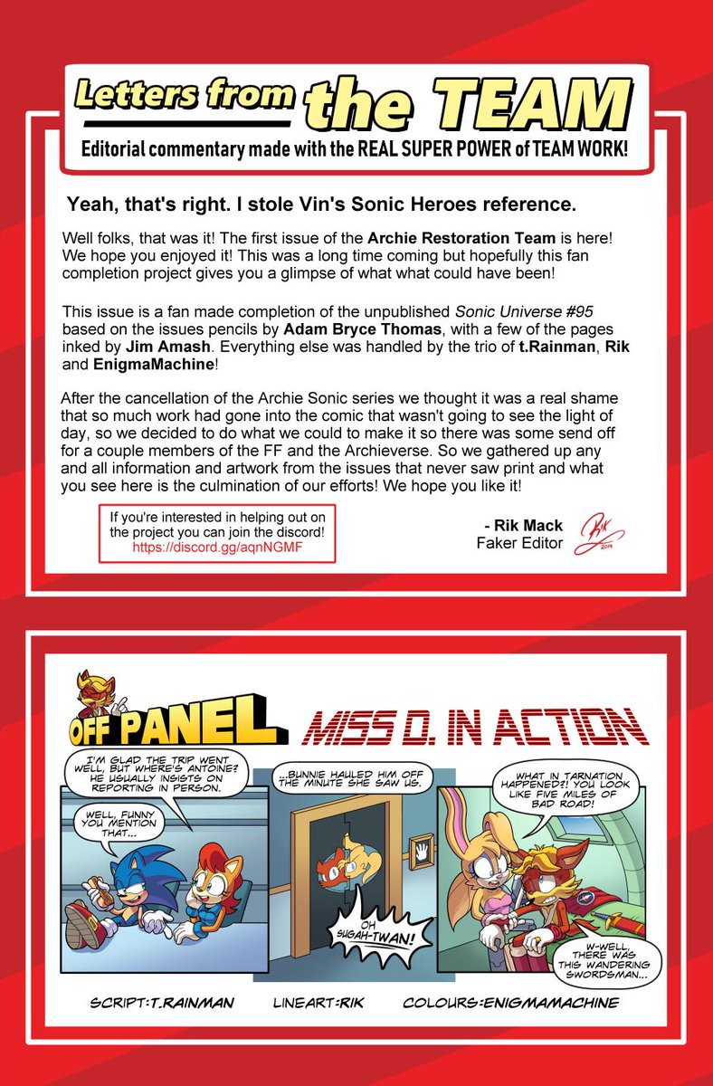 #SU95 of the#ArchieSonic Restoration Project! Hope you enjoyed the show! If you did, go tell Adam Bryce Thomas you love his stuff, go thank Vincent Lovallo for putting together the team and editing the original comic!pic.twitter.com/i3dI3YsftT