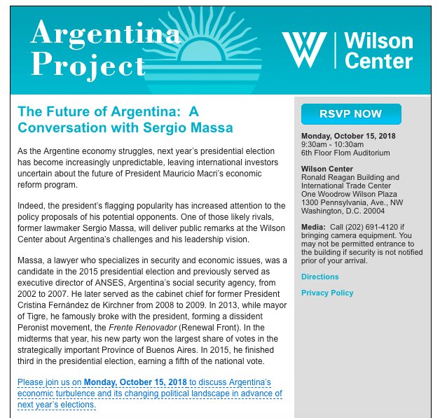 As economic troubles imperil President @mauriciomacri's reelection, @LATAMProg is thrilled to host a leading opposition candidate, @SergioMassa, to discuss his vision for #Argentina's future. Join us on October 15, https://engage.wilsoncenter.org/onlineactions/1Bc13-gcVEeCLQwwleeVhg2 …. @TheWilsonCenterpic.twitter.com/1M8KeTsSP3