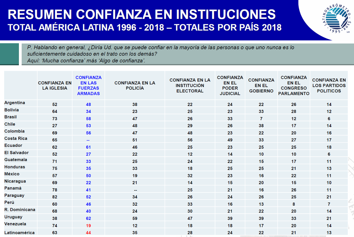 Military modernization will require tough decisions in an age of austerity, but notably, despite its "Dirty War" legacy, #Argentina's armed forces remain a popular institution, held in higher regard than the courts, government or congress, according to @Latinobarometro.pic.twitter.com/ha4JC8qaMO