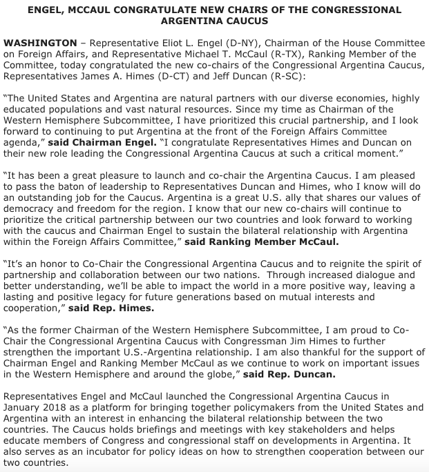 At @TheWilsonCenter's @LATAMProg, we're delighted to see the House Argentina Caucus expand its membership, and we look forward to supporting its important efforts to strengthen U.S.-#Argentina relations.https://twitter.com/HouseForeign/status/1138910627676786688 …