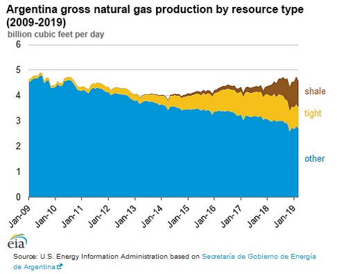 Shale gas production in #Argentina tripled last year, fueled in part by a government subsidy for producers, according to the @EIAgov report. However, in January, President @mauriciomacri suspended production incentives to reduce the budget deficit. 2/