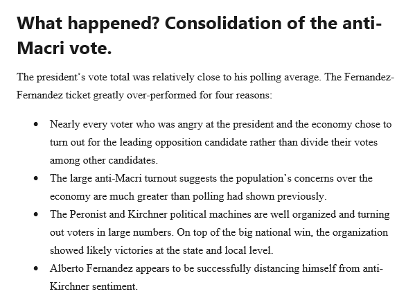 "Alberto Fernández appears to be successfully distancing himself from anti-Kirchner sentiment," @bloggingsbyboz writes in the Latin America Risk Report, which is promising for the opposition, but "Argentina stocks, bonds and the peso are going to crash today."pic.twitter.com/2FXJtua87g