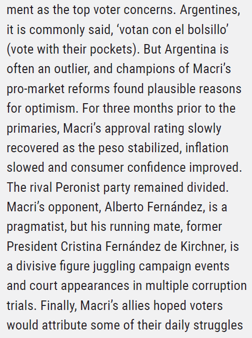 Why were Sunday's primary results so unexpected? "Argentines, it is commonly said, ‘votan con el bolsillo,' But Argentina is often an outlier, and champions of Macri’s