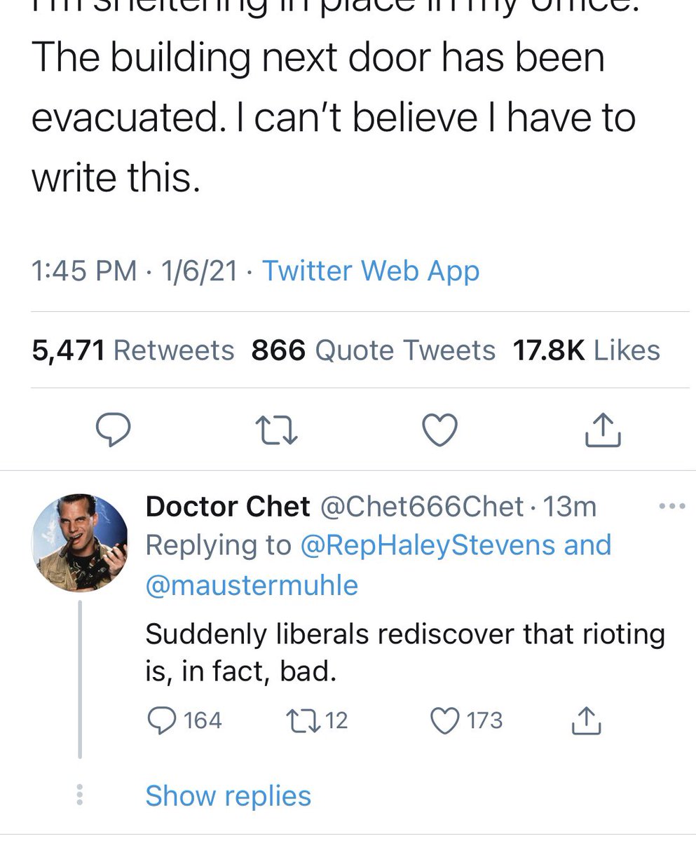 I know Twitter doesn’t care about details, but this tweet was sent as people protested outside the Capitol, prior to news of it being breached.