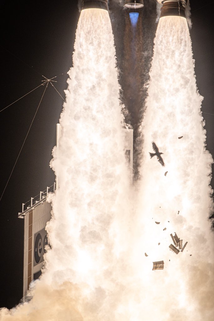 Sometimes luck just happens to fly by — check out this frame I captured of Tuesday’s Ariane 5 rocket launch, featuring a bird fleeing the launchpad.