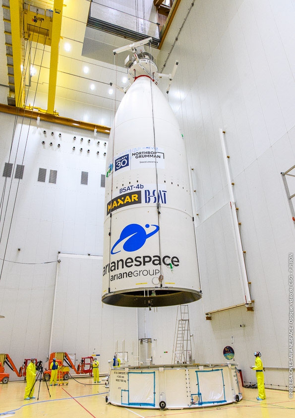 Le décollage du prochain vol @ariane5, #VA253, est prévu ce 28 juillet. En photo, la coiffe qui recouvre la charge utile: les satellites @Maxar BSAT-4b, @northropgrumman Galaxy30 et Mission Extension Vehicle-2 👉https://www.arianespace.com/mission-update/bsat-4b-checkout/ …pic.twitter.com/ckajmG3Zgu