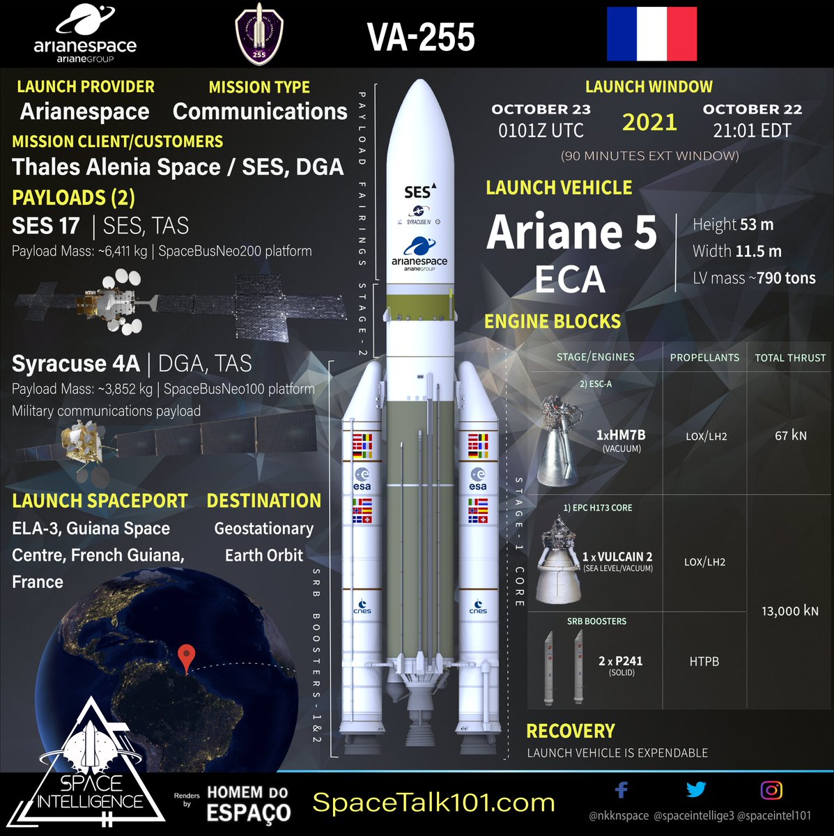 Orbital Launch no.102 of 2021 🇫🇷🚀🇫🇷🛰️🛰️! @Arianespace's #Ariane5🚀 #VA255 will be launching the heaviest combination of payloads (10,263 kg) to the Geostationary Orbit, consists of #SES17 from SES and #Syracuse4A from DGA, with the common prime contractor of Thales Alenia Space.pic.twitter.com/7vGMUN727s