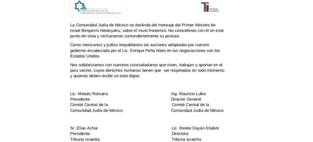 #MásLeídas en #Aristegui Comunidad judía de México se deslinda del tuit de @Netanyahu, en el que aprueba muro http://ow.ly/Uy2f308uSvw pic.twitter.com/YdO8EEu0Al