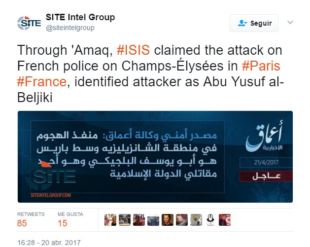 Estado Islámico se adjudica atentado en Campos Elíseos; Hollande convoca reunión de seguridadhttp://ow.ly/fefd30b2eYYpic.twitter.com/yn2qBy5Lgs