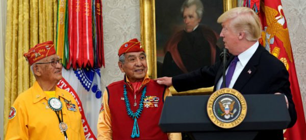 Trump no se puede contener de lanzar insultos de 4o de primaria.Mencionó acertadamente, q los Navajo están en EU antes que nadie más, no menciono las decenas d tratos con los indios rotos por el gobierno.El pez por su propia boca muere, sigue hablando, Flynn ya lo está haciendo