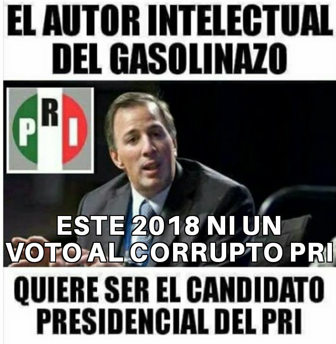 Pero qué tal los tres impuestos que le tiene a la gasolina, ya que el gran presidenciable de Meade se me ocurrió poner. Acuérdese al momento de votar.!!!!!