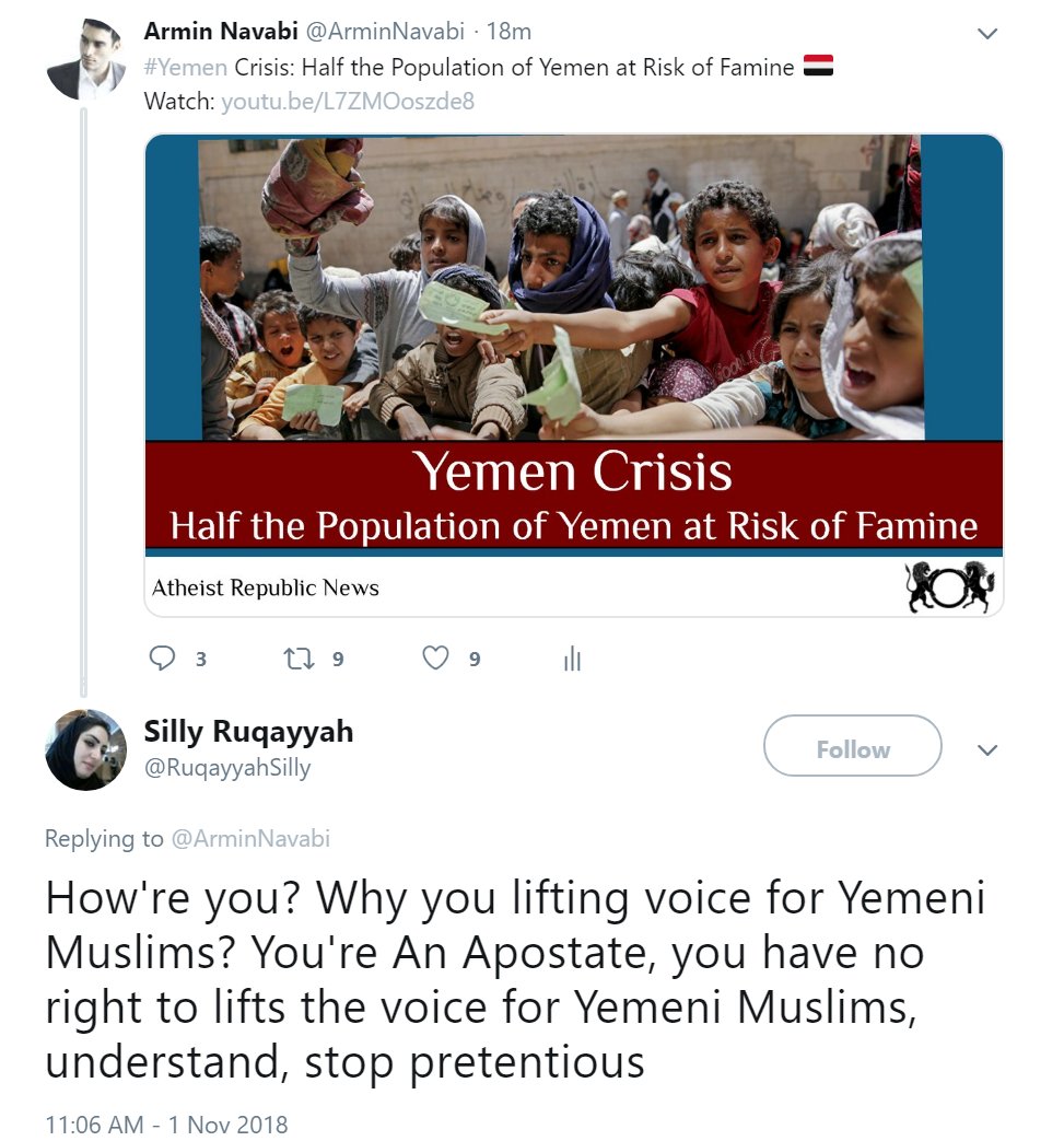 Ask her to clarify which law of which land, or which verse of which book, denies a given group of people (“apostates”) the “right” to acknowledge the fact that Yemenis (who may or may not be Muslims) are dying of starvation.
