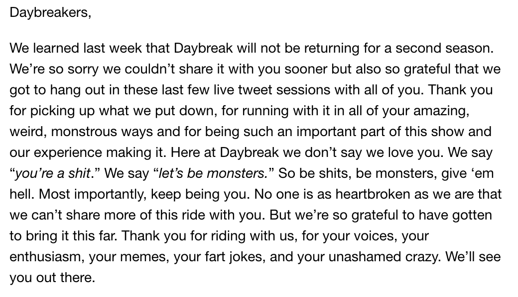 I just finished it and wanted to see when the second season starts, now this :( i hope its not because the viewers where to low. Then i am truly sorry i watched it so late. Thanks for the good show... Daybreak was something you cant do as a book and used the medium well. Thanks!