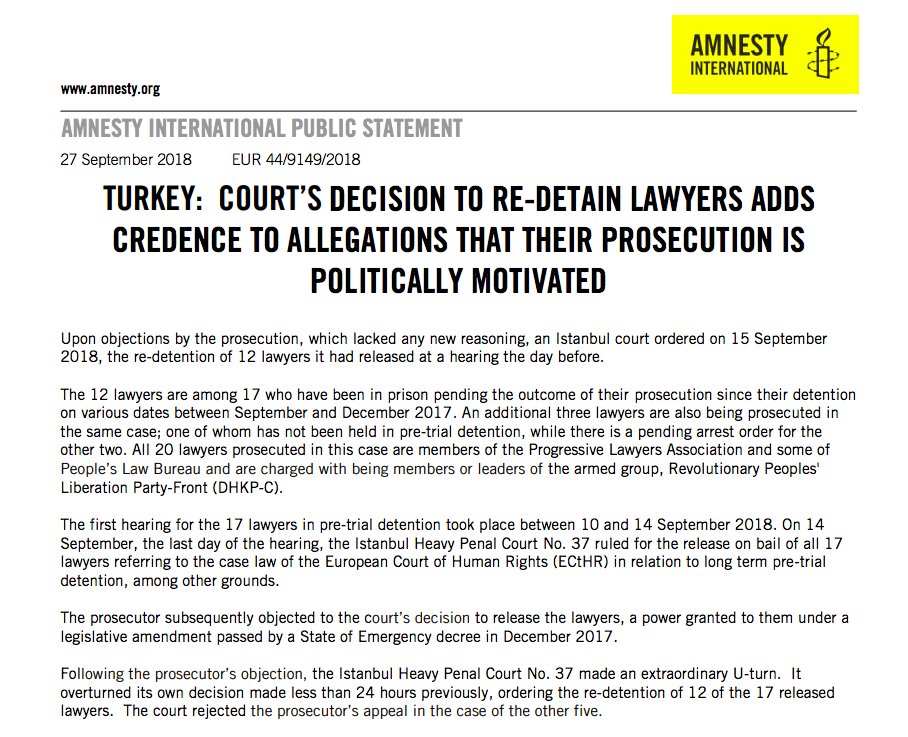 #Turkey - Report by @amnesty on re-detention of 12 lawyers: