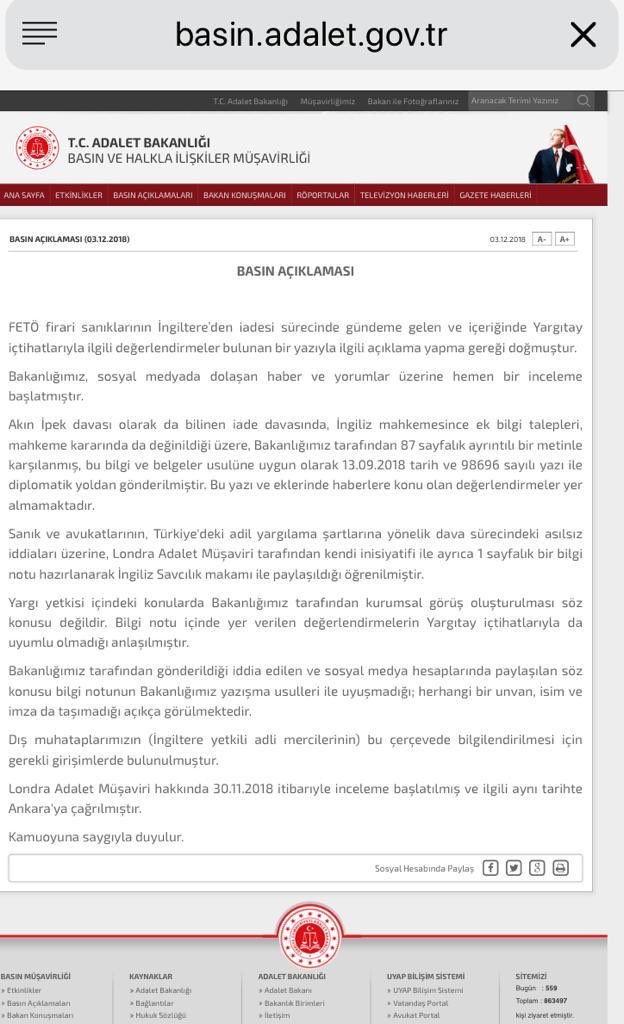 Turkish Ministry of Justice says the written statement submitted to the Westminister Court by the Turkish Ministry of Justice is misleading and therefore an investigation was launched. @Barristerblogpic.twitter.com/wHBee8vOZF