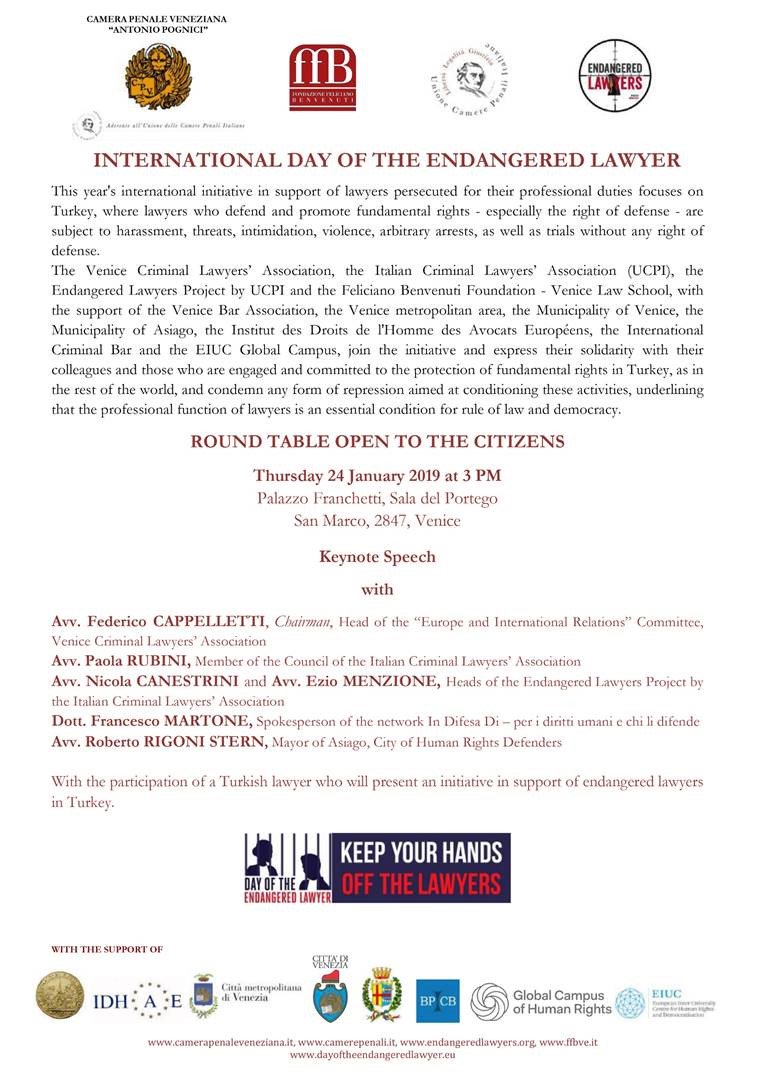 INTERNATIONAL DAY OF THE ENDANGERED LAWYER The BPI-ICB-CAPI supports the UCPI in its initiative of the next 24 of January in Venice, in defense of the threatened lawyers. You’ll find below the program of the event.pic.twitter.com/VugzGxmNOe