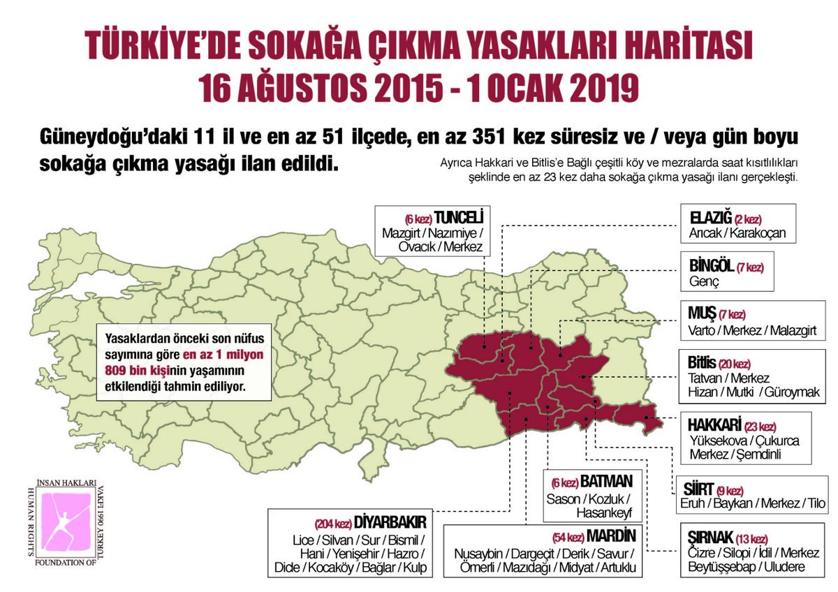 Since 2015, Turkish Government has declared curfew at least 351 times in 11 provinces and 51 subprovinces / counties. Source is