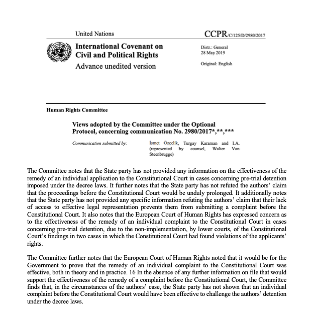 #Turkey @UNHumanRights HRC has opted Turkish Constitutional Court is not effective domestic remedy for pre-trial detention cases. @nateschenkkan @BarHumanRights @LSHumanRights @LRWCanada @IBAHRI @coe @CoESpokesperson @ECHR_Press @amberinzaman @KeremALTIPARMAK @cyberrightspic.twitter.com/zKhBkAPAF2