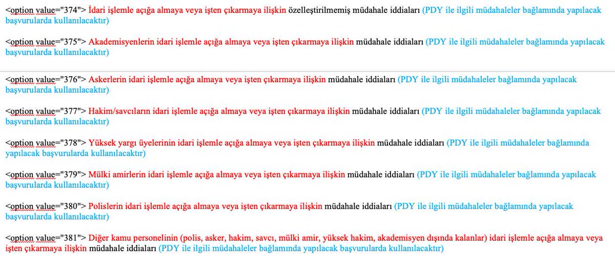 Templates of the verdicts has specific codes and are reachable through TCC's website. Each of 13 templates has an explanation as 'it could be used in application by dismissed (i) judges, (ii) police officers, (iii) employees of dissolved legal persons etc'https://twitter.com/AvukatMektubu/status/1144619120723468288 …