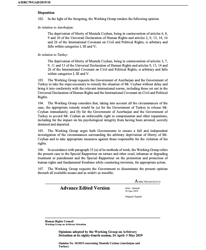 UNWGAD opted that Azerbaijan breached arts. 6, 8,9, 10 of the UDHR and articles 2, 9, 13, 14, 16, 26 of the ICCPR by extraditing Mustafa Ceyhan to Turkey where he would be / had been subjected to torture. @UN_SPExperts https://www.ohchr.org/Documents/Issues/Detention/Opinions/Session84/A_HRC_WGAD_2019_10.pdf …pic.twitter.com/G0ZPfYPzAV