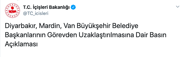 Turkish Government suspended Kurdish mayors of Van, Mardin and Diyarbakir (provinces) on grounds of ongoing criminal investigations towards them. Governors of respective provinces have been appointed as an acting mayor instead of those suspended.pic.twitter.com/lhg6qzZf7b