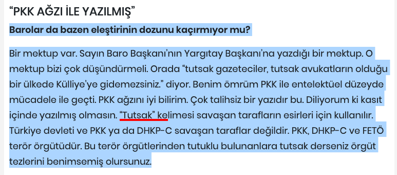 President of the Union of Turkish Bar Association, Metin Feyzioglu, accused the Izmir Bar w/ using jargon of PKK terrorist org | @ArrestedLawyers condemns Mr Feyzioglu for this blatant libel, and state its solidarity with @izmir_barosu. @CCBEinfo @UnionIntAvocats @ProtectLawyers
