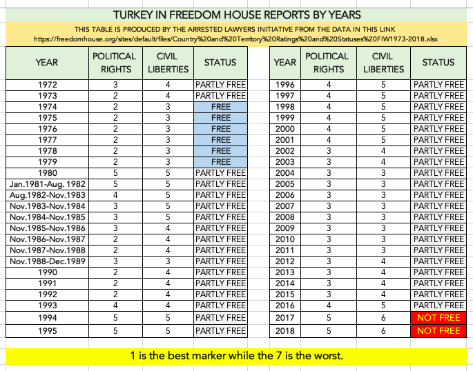 Turkey in @freedomhouse reports by years. In 2017-2018, Turkey for the first time was categorised as NOT FREE. @nateschenkkan @pen_int @article19org @globalfreemedia @fma_tr @davidakaye @harlemdesirpic.twitter.com/zsn2vrcvef