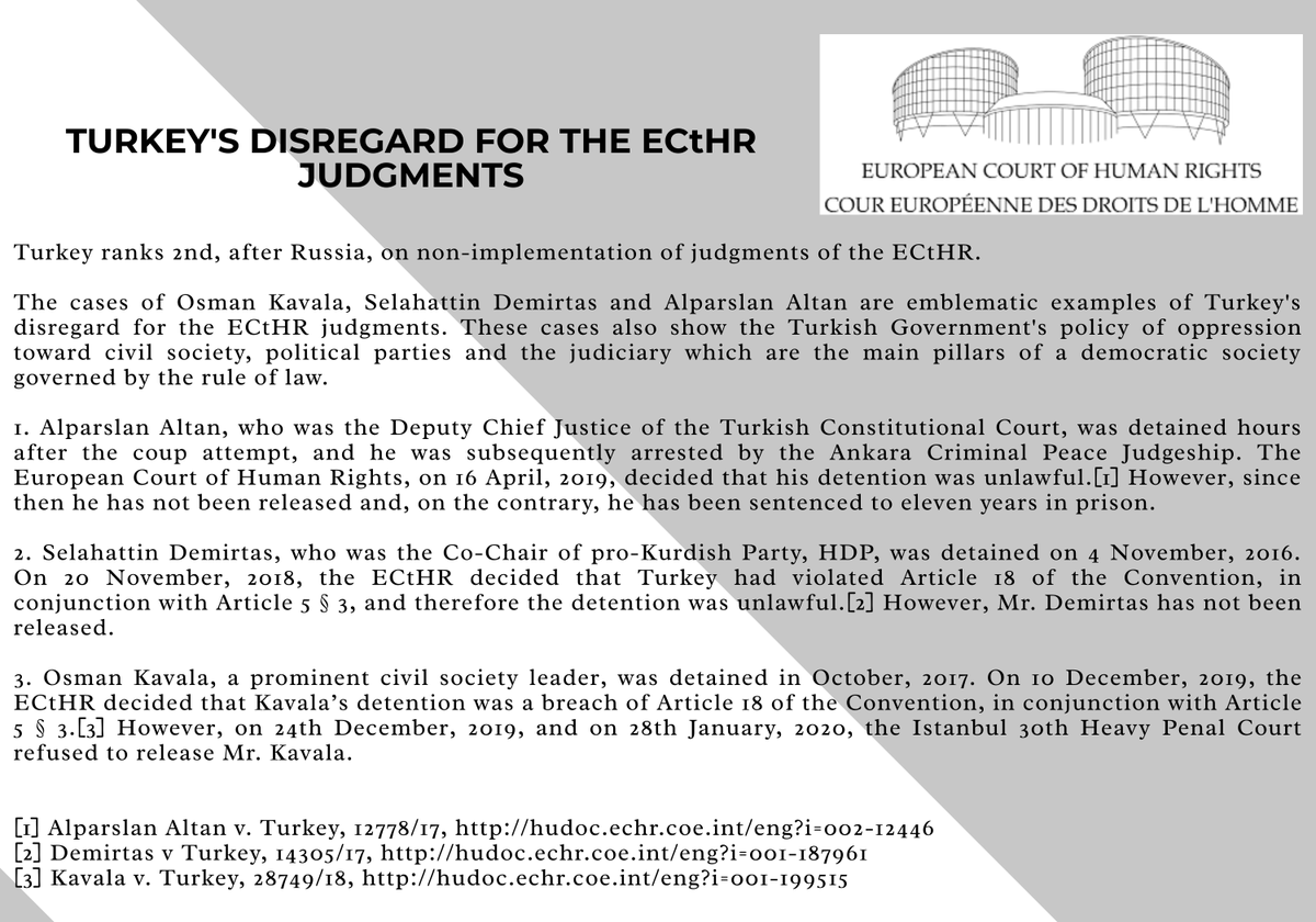 The cases of #OsmanKavala, #SelahattinDemirtas and #AlparslanAltan are emblematic examples of Turkey's disregard for the ECtHR judgments. @MilenaBuyum @FreeOsmanKavalapic.twitter.com/AuetHllzaT
