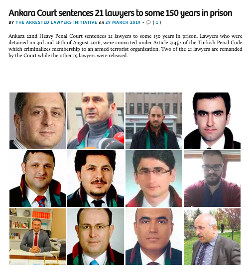 Ankara Regional Appeal Court upheld 150-year prison sentence given to 21 lawyers. @NachoSAmor @CCBEinfo @ProtectLawyers @UIAdefense @BarHumanRights @L4L_INT @CommissionerHR @yavuzbaydar4 @JusticeDefend https://twitter.com/ArrestedLawyers/status/1111700165252009986 …pic.twitter.com/78orQCJMsz