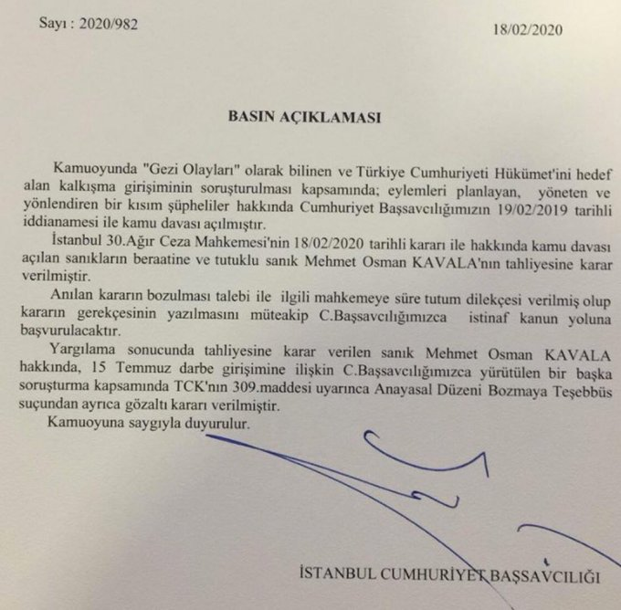 Here is the official statement by Istanbul Chief Public Prosecutor (CPP) on the new detention order regarding Osman Kavala. It is also said in the statement that Istanbul CPP will appeal the decision of acquittal as well.pic.twitter.com/hk5uCFQOs4