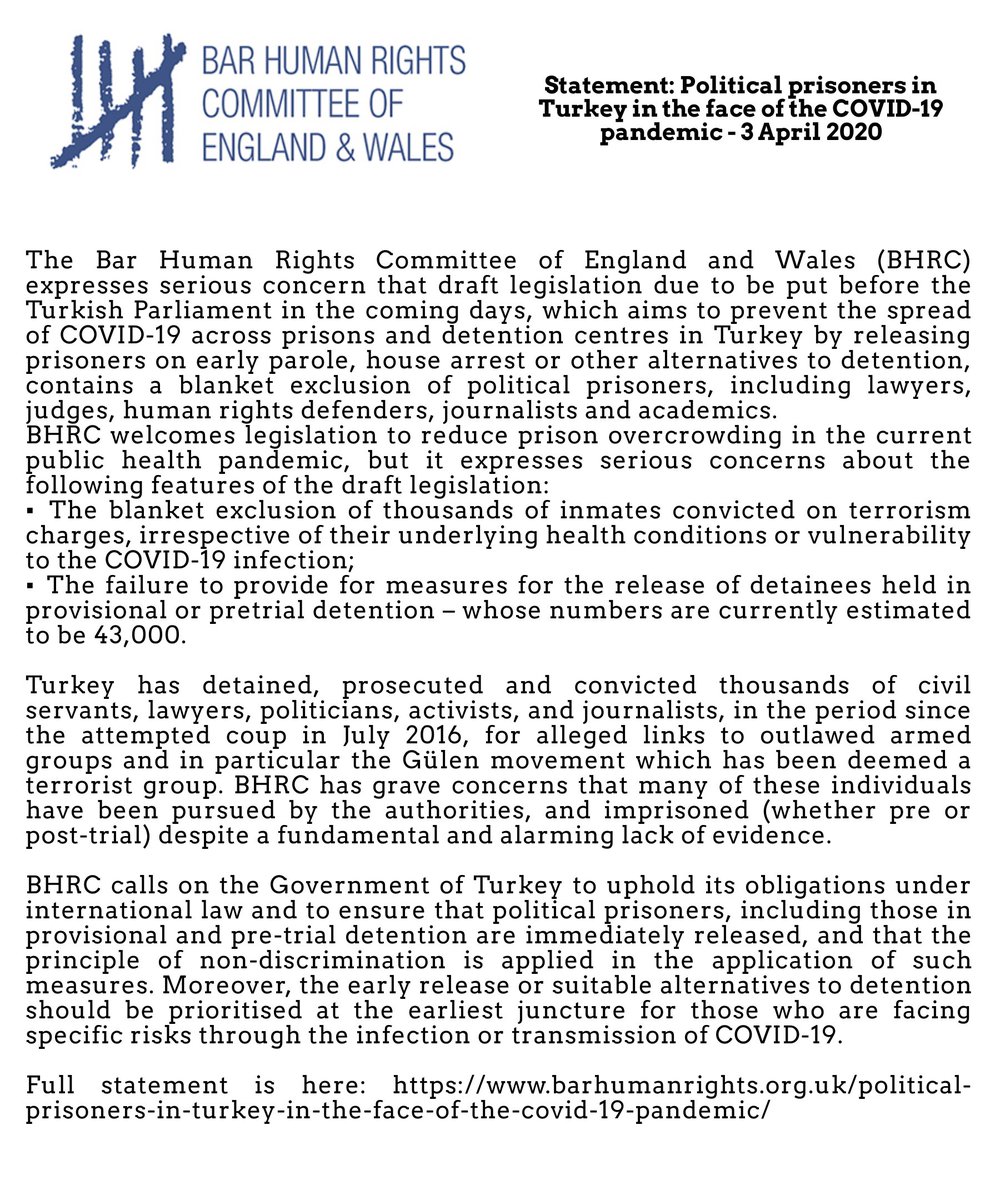 Statement: Political prisoners in Turkey in the face of the COVID-19 pandemic (summary translation) | COVID19 Salgını karsısında Türkiye'deki siyasi mahpuslar (özet tercüme)- İngiltere ve Galler Barosu İnsan Hakları Komitesi @BarHumanRights pic.twitter.com/o1xhdwQUKH