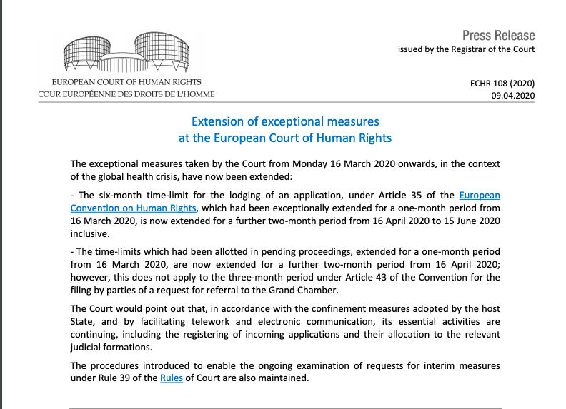 The six-month time-limit for the lodging of an application, under Article 35 of the ECHR, which had been exceptionally extended for a one-month period from 16 March 2020, is now extended for a further two-month period from 16 April 2020 to 15 June 2020 inclusive. https://twitter.com/ECHR_CEDH/status/1248178852330946560 …pic.twitter.com/f14Pskhj4K