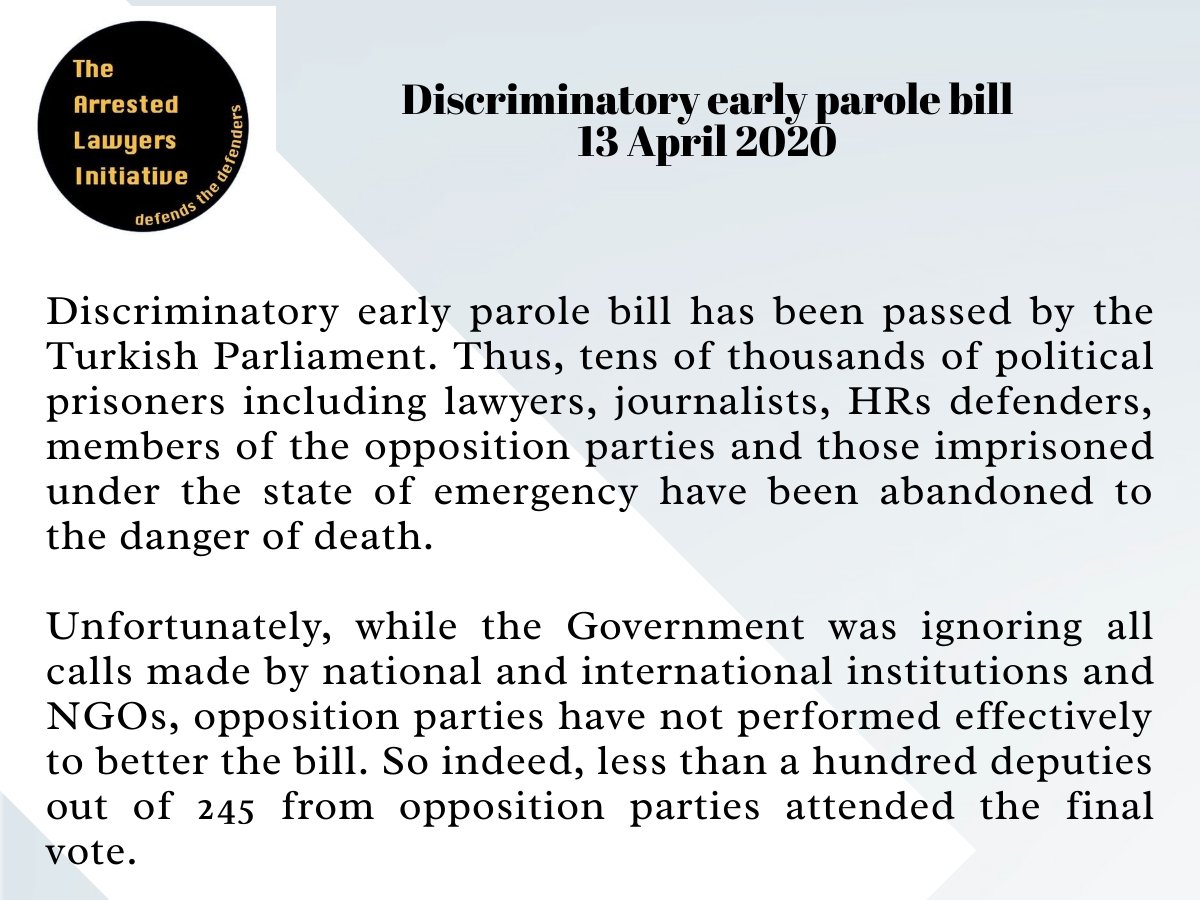 Discriminatory early parole bill has been passed by the Turkish Parliament. Thus, tens of thousands of political prisoners incl lawyers, journalists, HRs defenders, members of the opposition parties and those imprisoned under the SoE have been abandoned to the danger of death.pic.twitter.com/iqkHuQ7zMS
