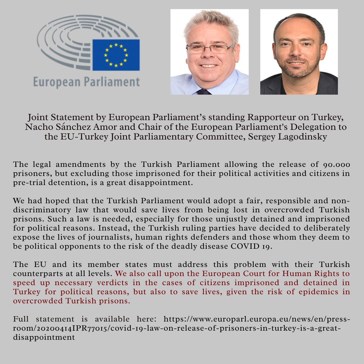 My new statement with my colleague @SLagodinsky on COVID-19: Law on release of prisoners in Turkey is “a great disappointment” https://www.europarl.europa.eu/news/en/press-room/20200414IPR77015/covid-19-law-on-release-of-prisoners-in-turkey-is-a-great-disappointment … vía @Europarl_EN