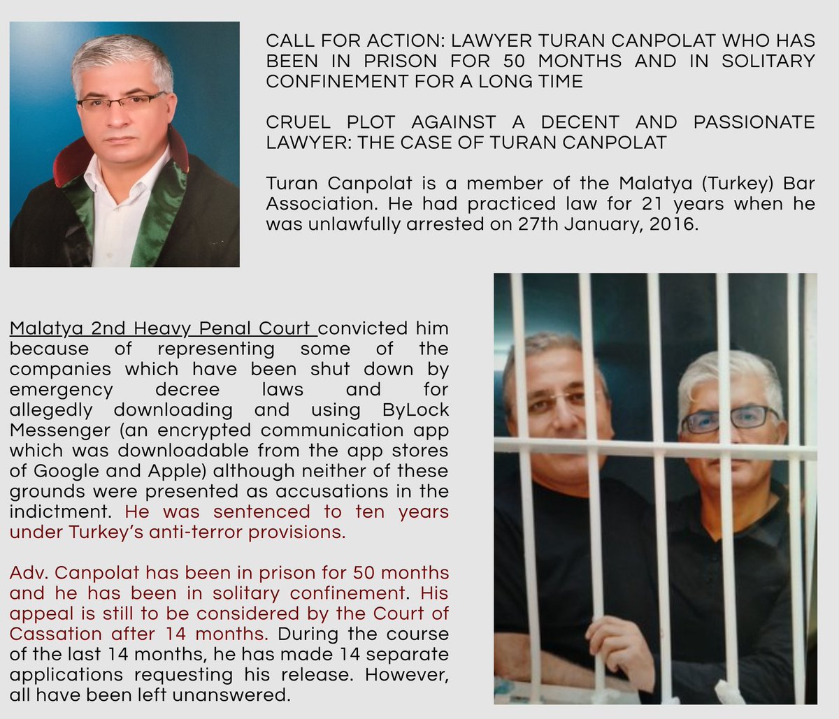Call for action: The case of lawyer Turan Canpolat who has been imprisoned since 27 January 2016 and in solitary confinement.pic.twitter.com/79mjEtLHcS