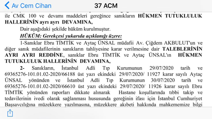 Istanbul Court refused the request for release of Adv. Ebru Timtik and Adv. Aytac Ünsal despite a medical report proving that they can't remain in prison due to their health conditions.pic.twitter.com/s5pldb8naP