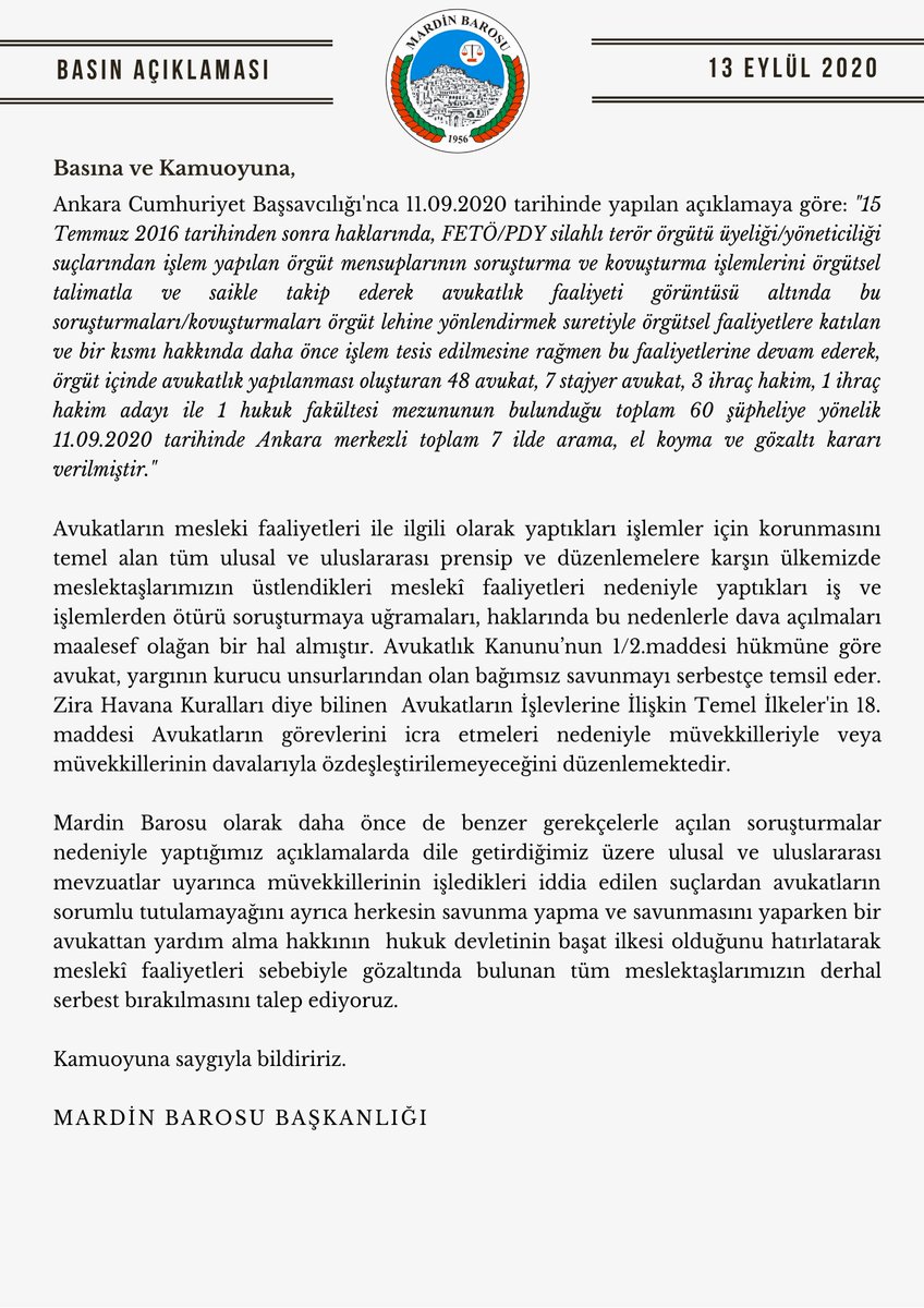 Mardin Barosu olarak daha önce de benzer gerekçelerle açılan soruşturmalar nedeniyle yaptığımız açıklamalarda dile getirdiğimiz üzere ulusal ve uluslararası mevzuatlar uyarınca meslekî faaliyetleri sebebiyle gözaltında bulunan tüm meslektaşlarımız derhal serbest bırakılmalıdır. pic.twitter.com/z3jqOjAlLz