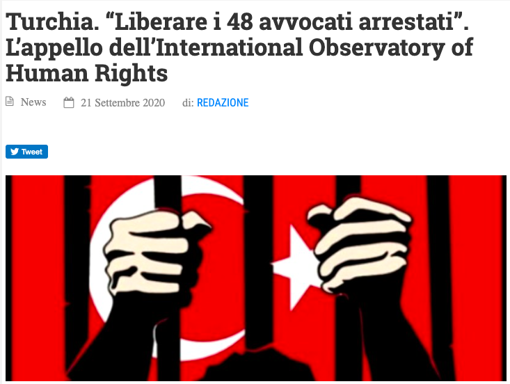 Turchia. “Liberare i 48 avvocati arrestati”. L’appello dell’International Observatory of Human Rights – Articolo21 https://www.articolo21.org/2020/09/turchia-liberare-i-48-avvocati-arrestati-lappello-dellinternational-observatory-of-human-rights/ …pic.twitter.com/HHGbb2CMVE