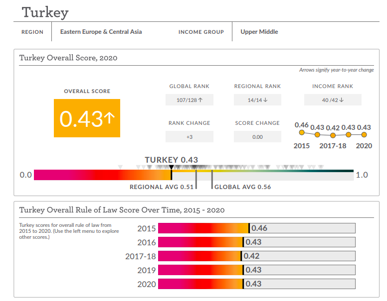 2020 report of @TheWJP has been published. Among 128 countries, Turkey ranks ▪️ 107th on overall score, ▪️ 124th on constraints on government powers, ▪️ 123rd on fundamental rights https://www.worldjusticeproject.org/rule-of-law-index/country/2020/Turkey/ …pic.twitter.com/1COJkYidXo