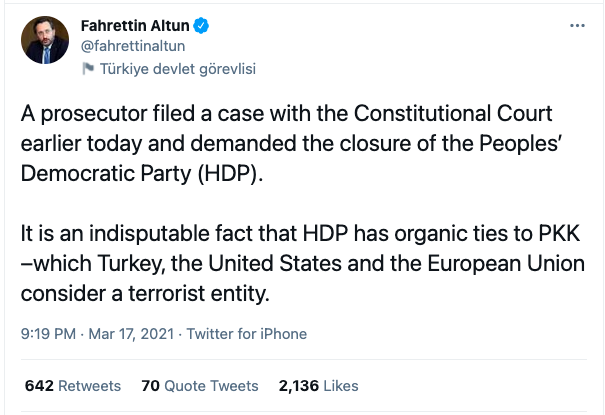 Not a prosecutor but the prosecutor who was appointed by Erdogan filed the case. 15 judges will try the case, # of 7 were appointed by Erdogan, # of 3 were elected by AKP through parliamentary majority, # of 5 were appointed by Gül who is the founder of AKP. So AKP will try HDP.pic.twitter.com/dgItgIsGI9