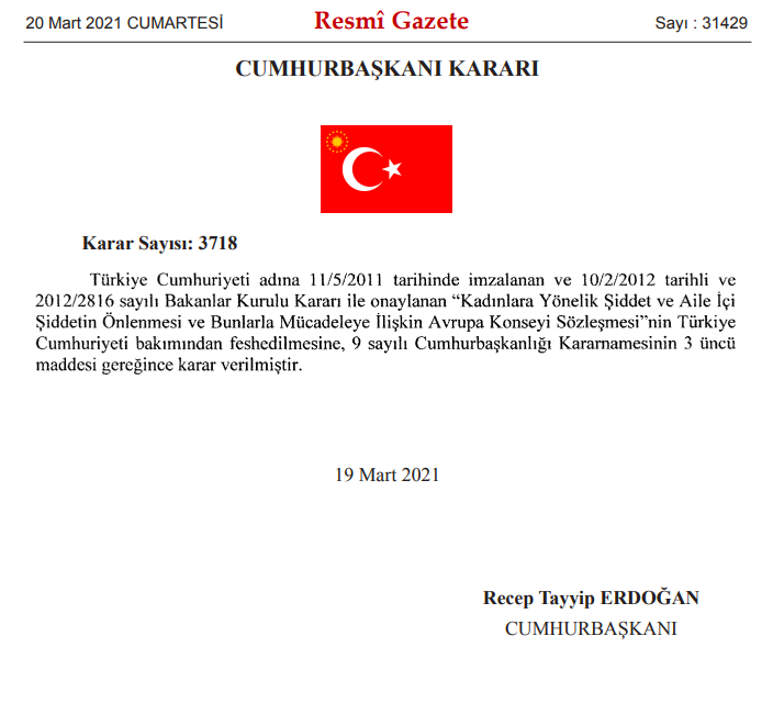 Turkey officially has withdrawn from Council of Europe Convention on preventing and combating violence against women and domestic violence.pic.twitter.com/tYDAH8rem8