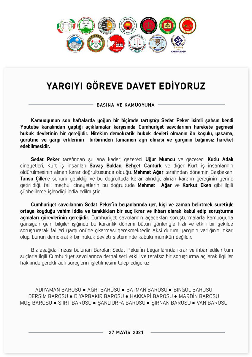 Several bar associations from Turkey call for a thorough investigation about the allegations -including extrajudical killings and drug trafficiking- uttered by mobster Sedat Peker.https://twitter.com/UrfaBarosu/status/1398192906297659395 …