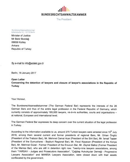 In the January, The German Federal Bar Association sent a letter to the Justice Minister to condemn the persecution of Turkish lawyers.pic.twitter.com/hTMbfnF1E5