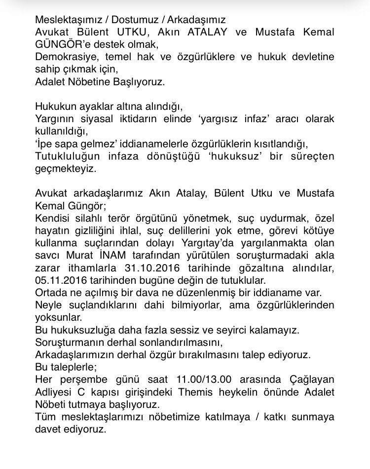 Av. Bülent Utku, Av. Akın Atalay, Av. Mustafa Kemal Güngör için başlayacak "Adalet Nöbetine" tüm meslektaşlarımızı çağırıyoruz.pic.twitter.com/AW9FxIij48