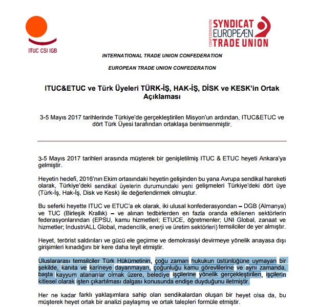 ITUC & ETUC ve Türk Üyeleri TÜRK-İŞ, HAK-İŞ, DİSK ve KESK’in OHAL, keyfi tutuklama ve işten atmalar hakkında ortak açıklamasıpic.twitter.com/dnBmqEHRib