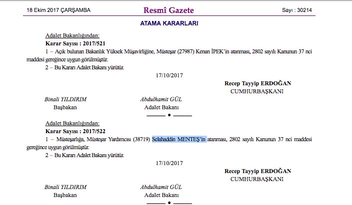 Dün, OHAL İşl İnceleme Kom Bşk S.Menteş, Adalet Bak Müsteşarlığı'na atandı.
